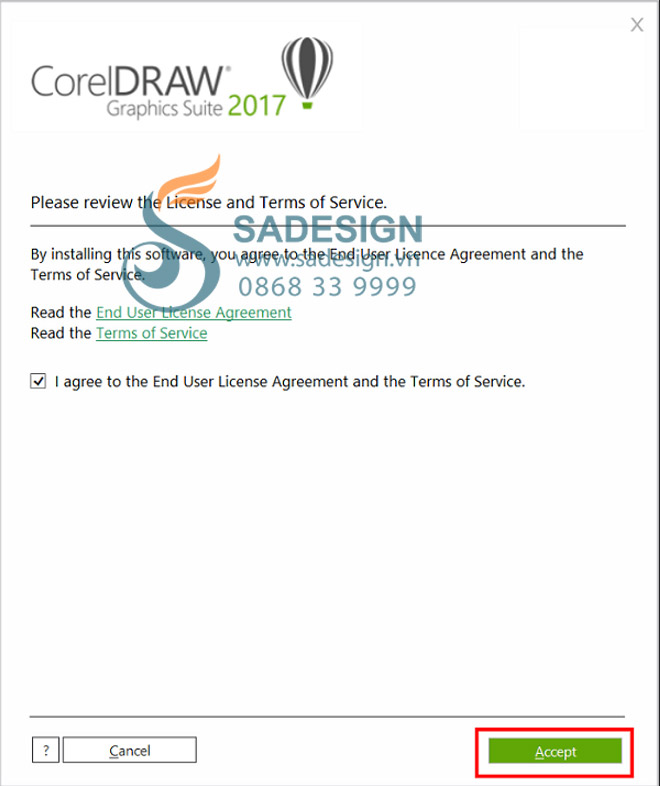 - Bước 2: Tick chọn vào ô ” i agree to the End User License…” và nhấn Accept