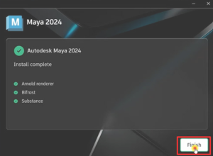 - Tiến hành chọn Finish. Đã cài xong. Hãy tiến hành kích hoạt Maya 2024 dưới nhé.