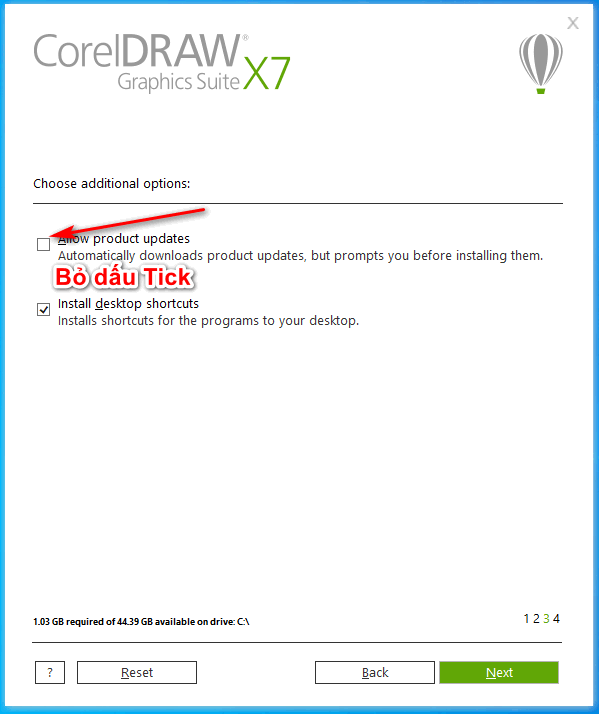 - Bước 8: Bỏ dấu tick “Allow product updates” và nhấn Next